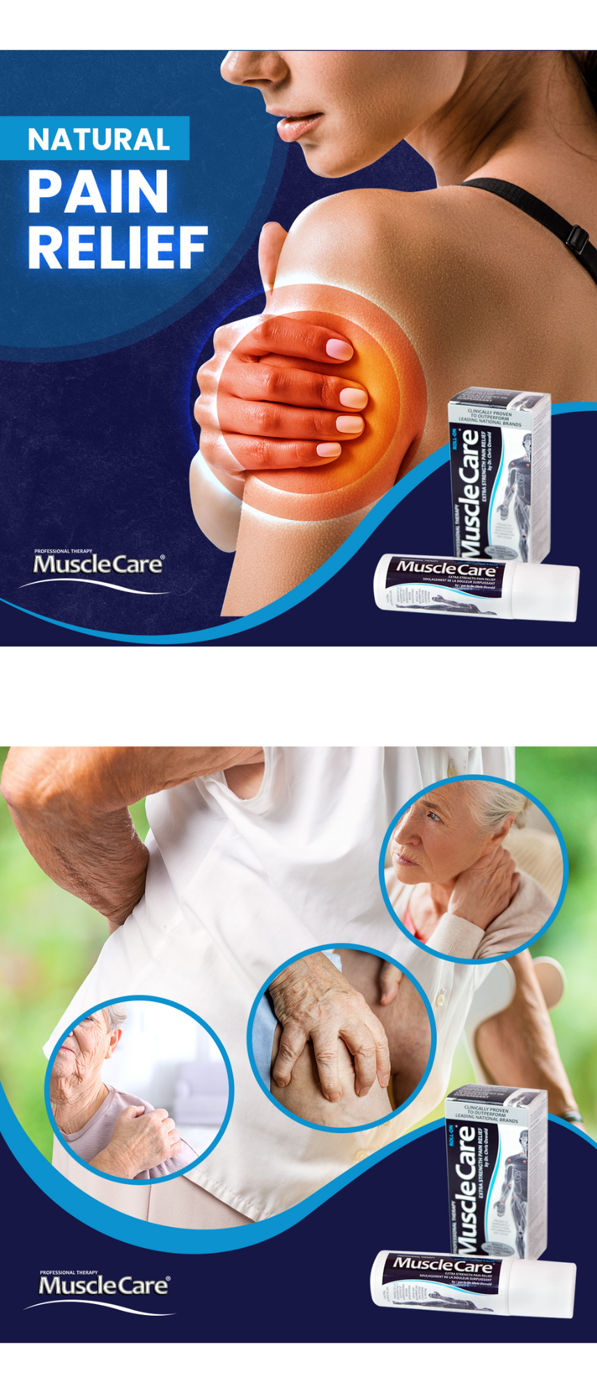 MuscleCare Roll-on and Ointment are effective in treating a wide variety of muscle and joint conditions, In a 2-year clinical test, the following conditions showed improvement with the application of both MuscleCare Roll-on and Ointment: acute & chronic lower back pain; shoulder pain, and stiffness; neck pain and stiffness; elbow pain; wrist pain; knee pain and arthritis; ankle strain, sprain, and arthritis; whiplash; muscle tension and migraine headache; bursitis - knee-region focused; Morton's neuroma; Facet Syndrome; Sacroiliac Syndrome; Disc herniation